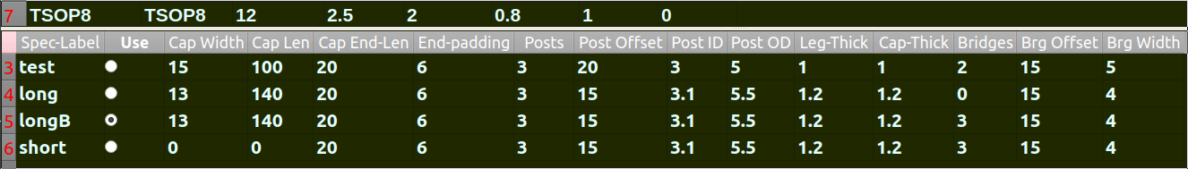Column: ‘Use’ – Click a Use cell to choose its row as specifications for making units. This is a radio button – only one row is selected at once.
